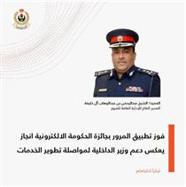 أكد سعادة العميد الشيخ عبدالرحمن بن عبدالوهاب آل خليفة مدير عام الإدارة العامة للمرور، إن فوز تطبيق eTraffic بـأفضل تطبيق للأجهزة الذكية ضمن جائزة التميز للحكومة الالكترونية، يعد انجازاً جديداً يع...