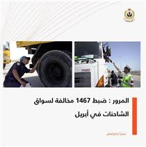 ضمن دورها في إنفاذ القانون والحد من المخالفات التي تؤثر على سلامة مستخدمي الطريق، رصدت الإدارة العامة للمرور 1467 مخالفة لسواق الشاحنات خلال شهر أبريل الماضي، منها تجاوز السرعة، وتجاوز النور الأحم...